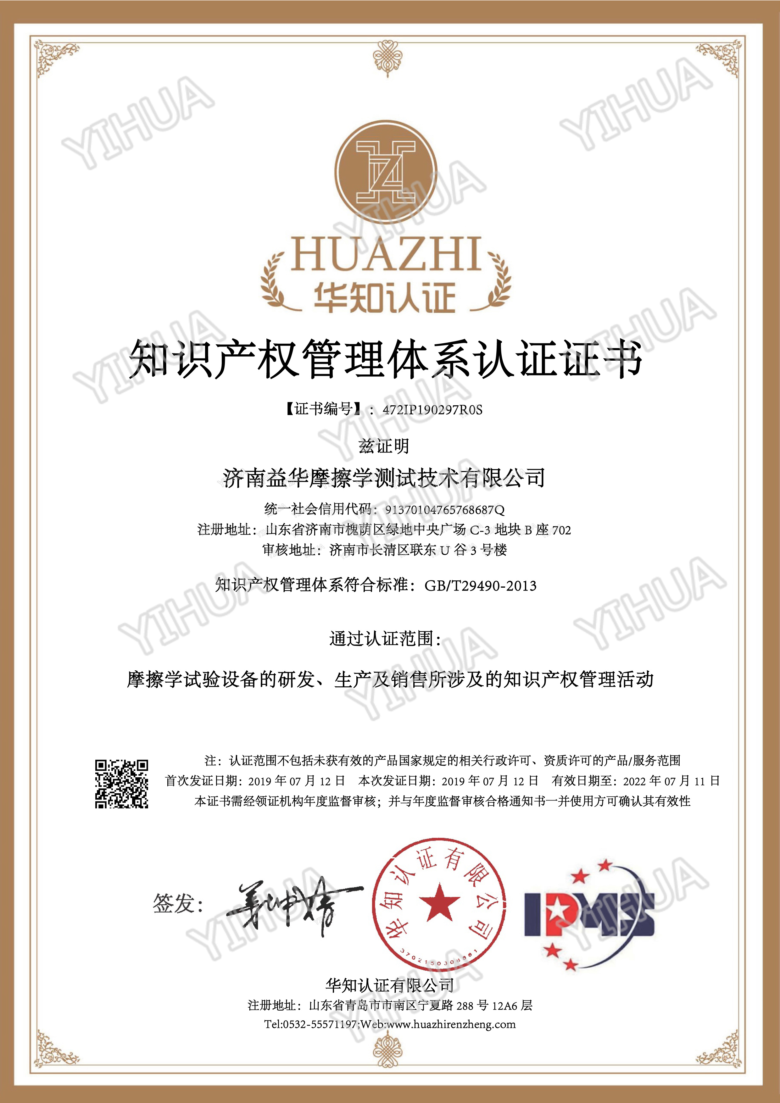 知识产权管理体系认证证书