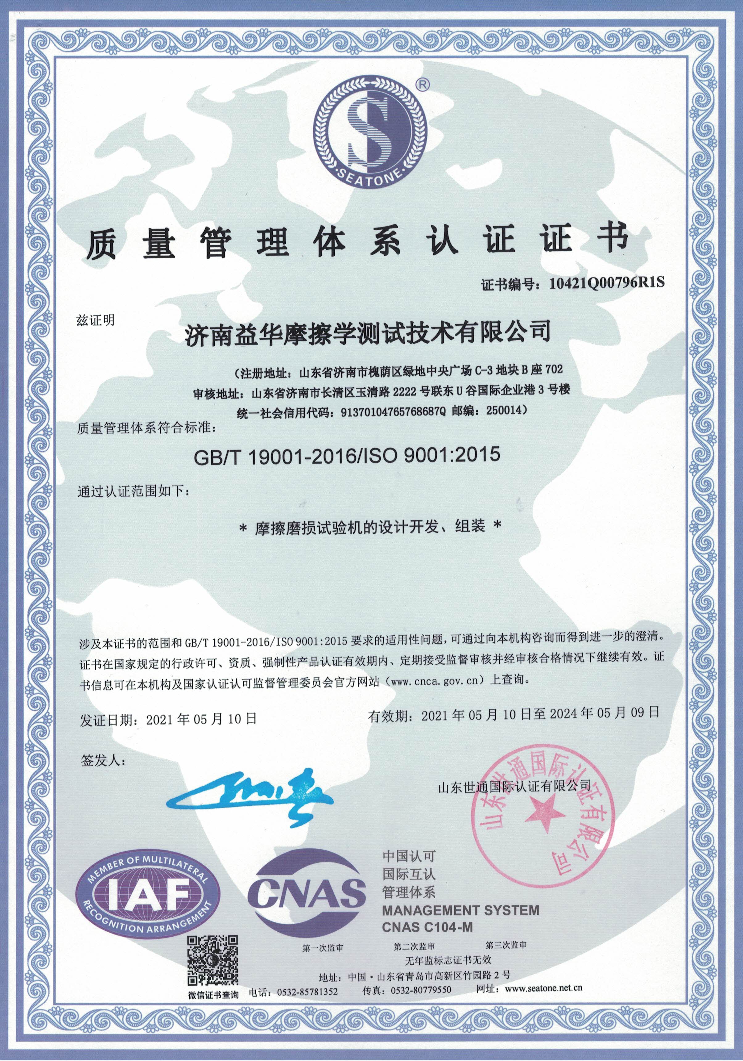 ISO9001质量管理体系认证证书