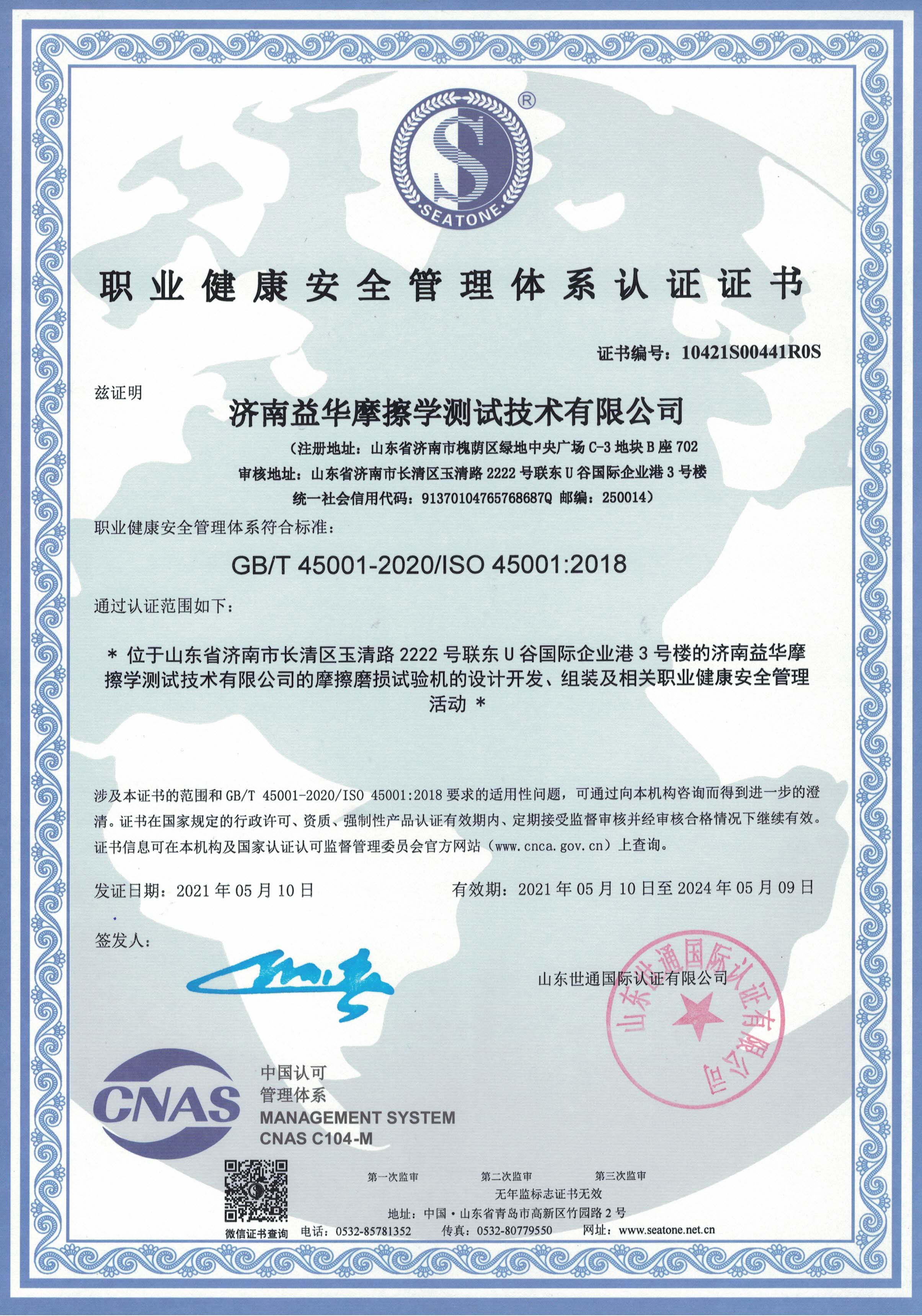 职业健康安全管理体系认证证书