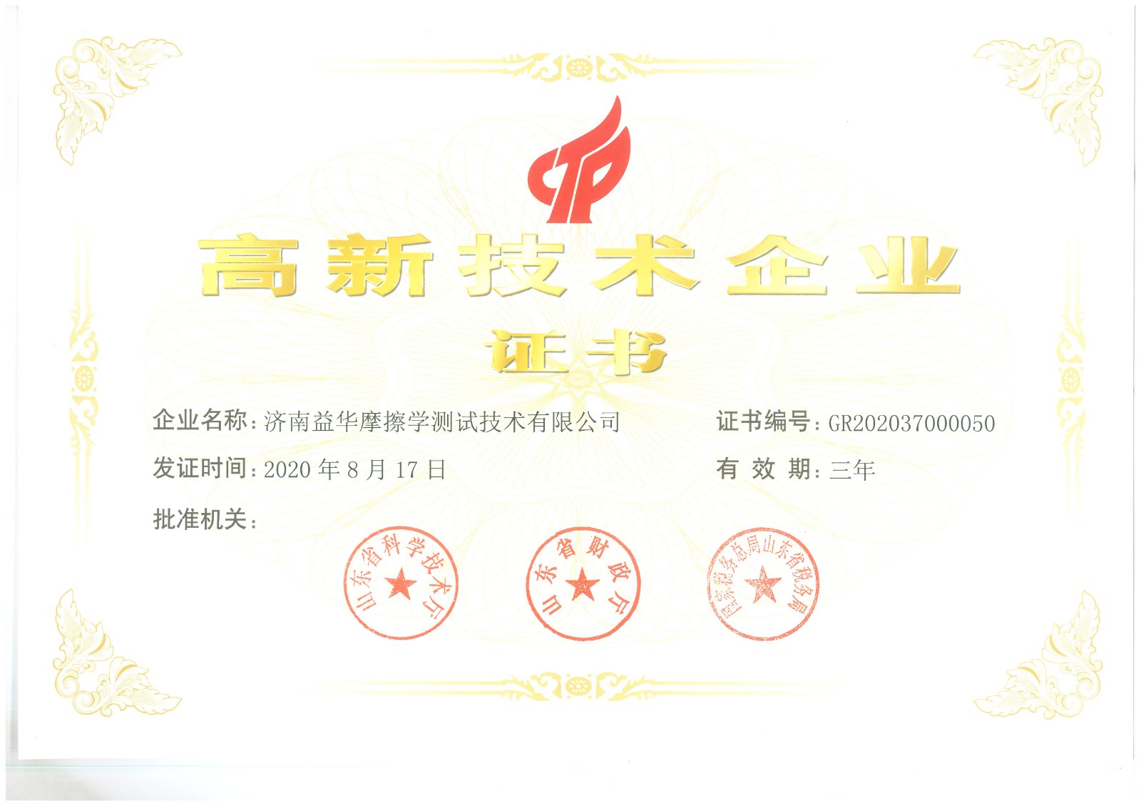 高新技术企业证书