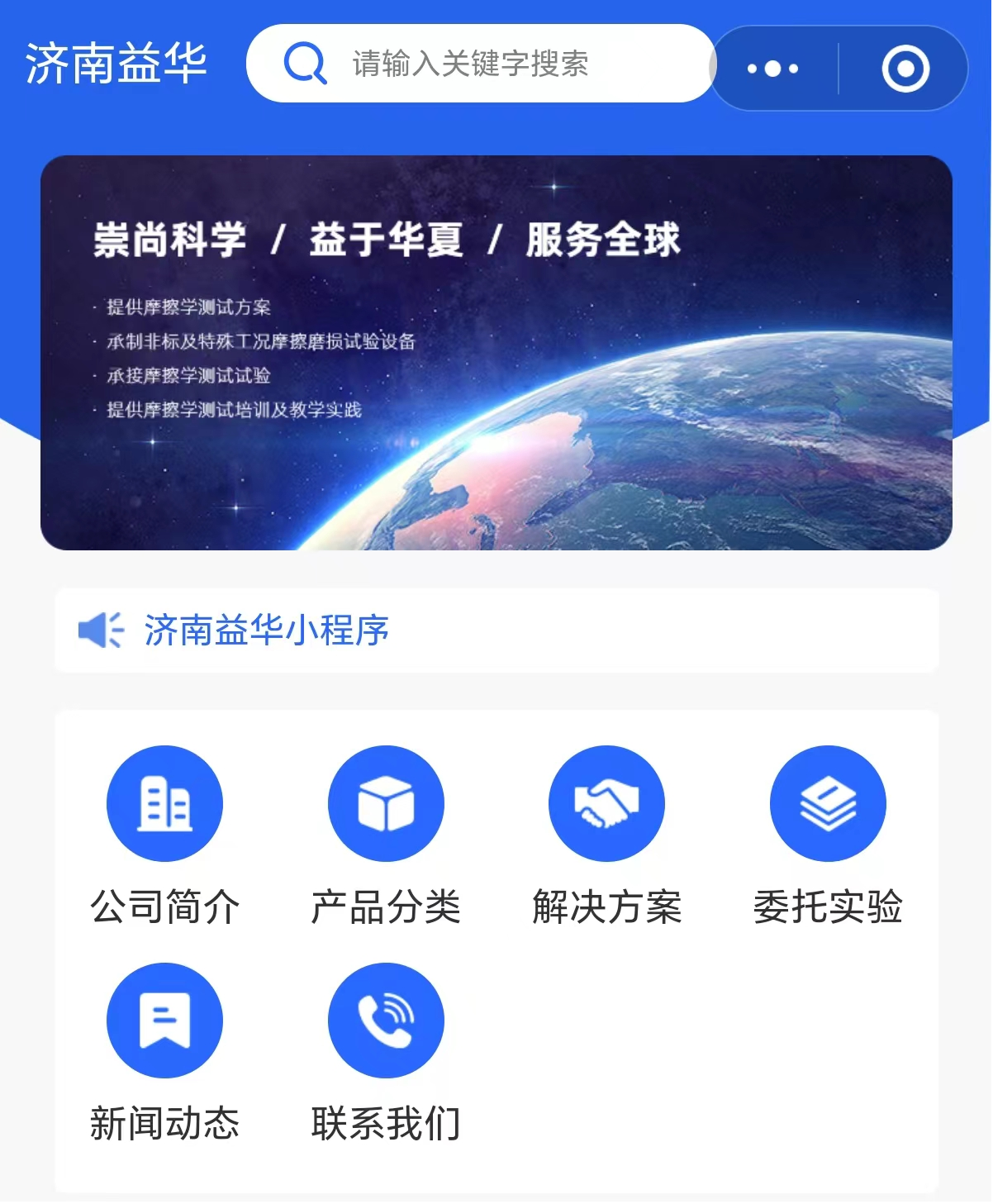 近日,我公司的微信小程序上线了!您可以通过扫码进入,也可以在“微信小程序”中搜索“济南益华摩擦学测试技术有限公司”。可以搜索您想了解的产品、方案或者摩擦学测试。在微信上搜索,方便便捷!!欢迎客户们浏览查阅!
